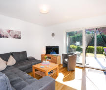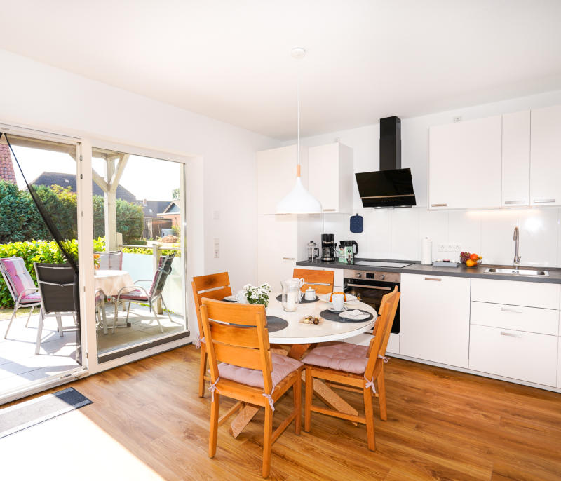 Eine bodentiefe Glasschiebetür trennt den offengestalteten Wohn- und Küchenbereich von der möblierten