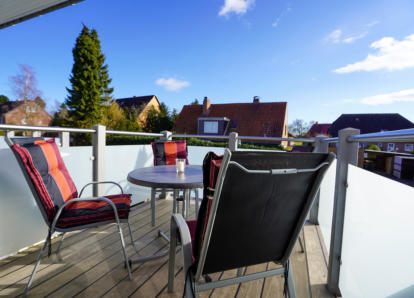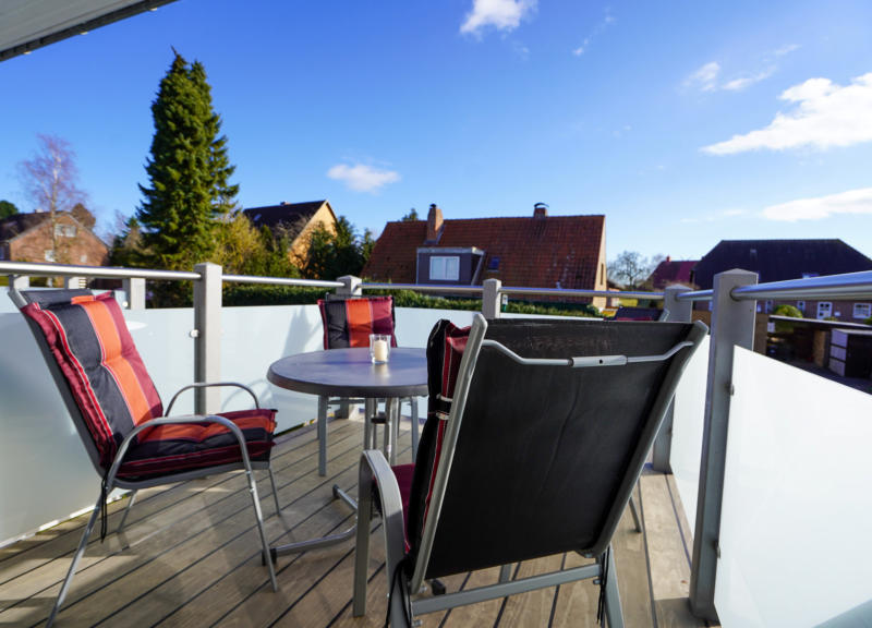 Wohn- und Essbereich vom möblierten Balkon in Südlage. Der obere Bereich der Ferienwohnung verfügt über