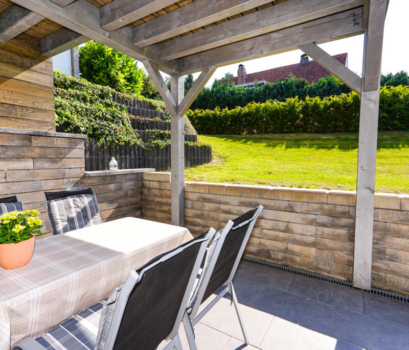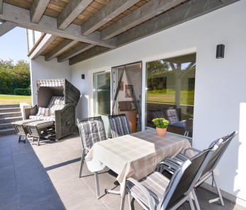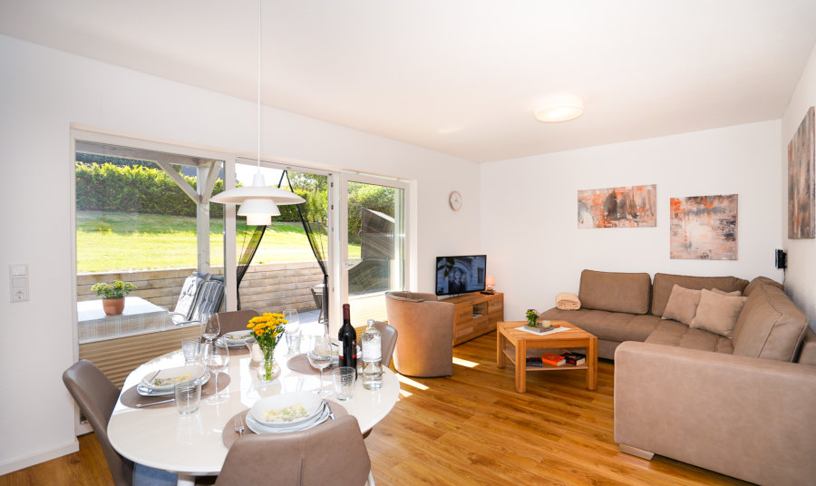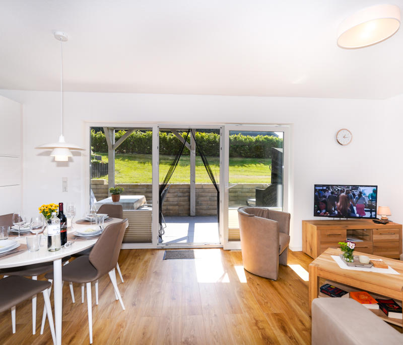 bodentiefe Glasschiebetür trennt den offengestalteten Wohn- und Küchenbereich von der möblierten Terrasse