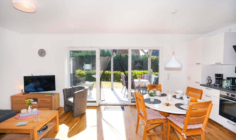Eine bodentiefe Glasschiebetür trennt den offengestalteten Wohn- und Küchenbereich von der möblierten