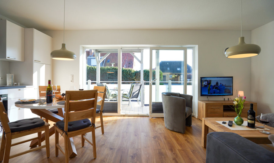 Fernsehen. Eine bodentiefe Glasschiebetür trennt den offengestalteten Wohn- und Küchenbereich vom