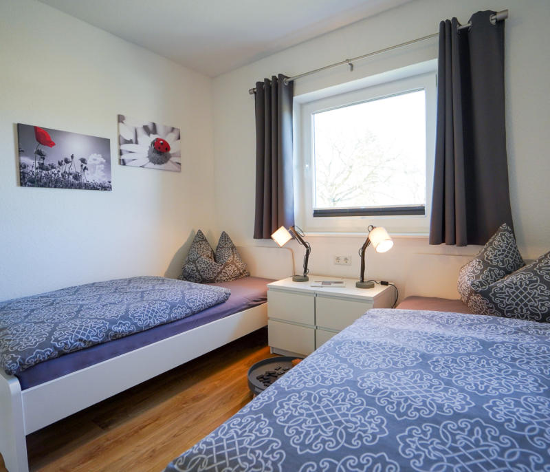 Schlafzimmer mit zwei Einzelbetten und ein Bad mit großer Dusche. Für unsere kleinen Gäste stellen wir sehr