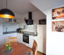 Gästehauses. Im unteren Bereich befindet sich eine moderne Wohnküche, ein Schlafzimmer mit zwei
