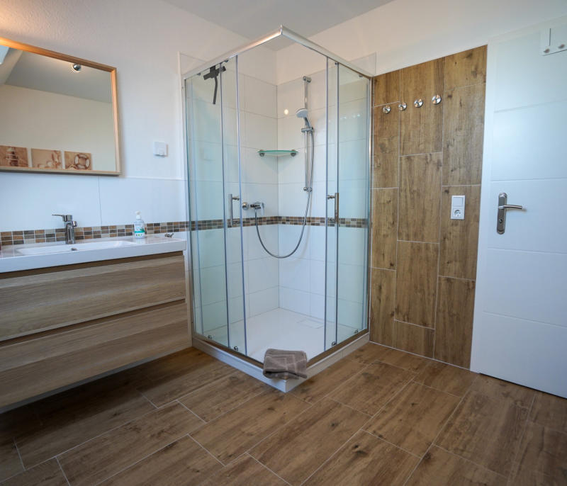 Einzelbetten und ein großes Bad mit Dusche. Eine bodentiefe Glasschiebetür trennt den offengestalteten